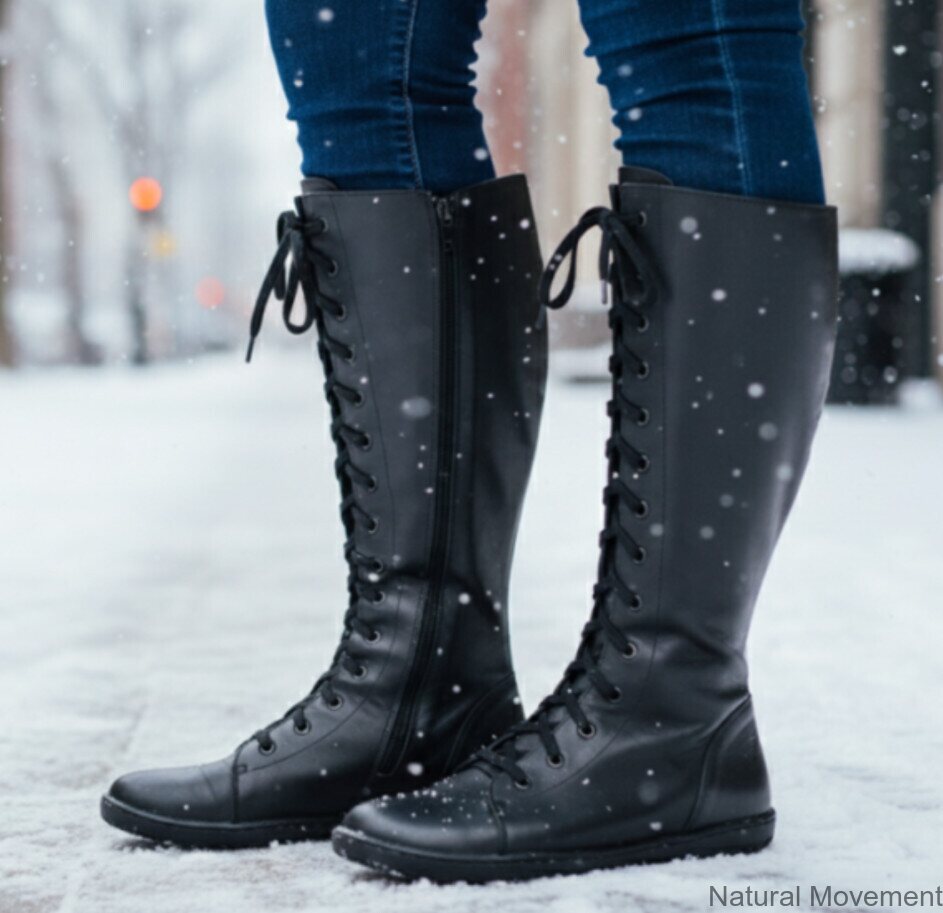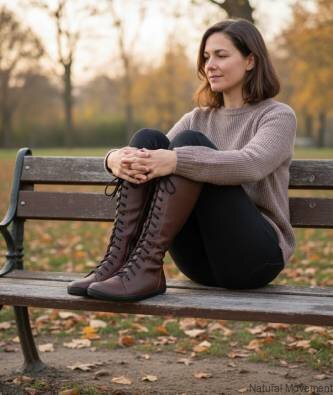 Bottes hautes pieds nus élégantes et confortables pour un usage quotidien. Dessus et doublure en cuir, fermeture éclair sur le côté. Semelle pieds nus étroitement cousue à la tige en cuir. Possibilité d'insérer des semelles intérieures en liège, incluses.