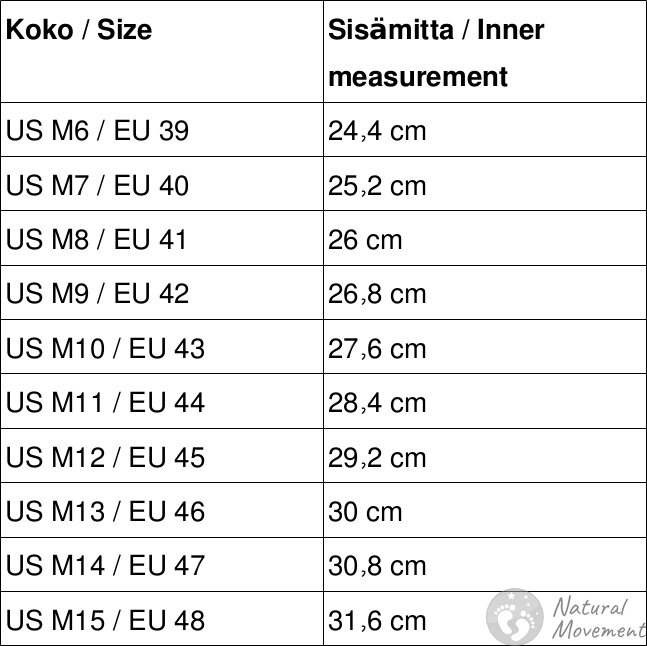 Naisten malli on täsmälleen sama, mutta pari milliä kapeampi (sopii kapeaan jalkaan paremmin). HUOM! Valitse koko aina sisämitan perusteella. Sandaaleihin sopiva käyntivara on noin 1 cm tai hieman alle.